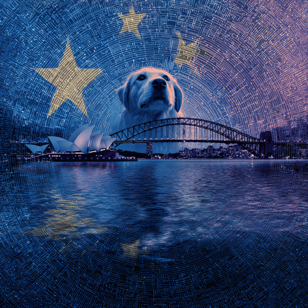 A loyal shadow sits at the gates of the unknown, guarding the quiet geometry of trust as worlds ripple beneath its watch.
