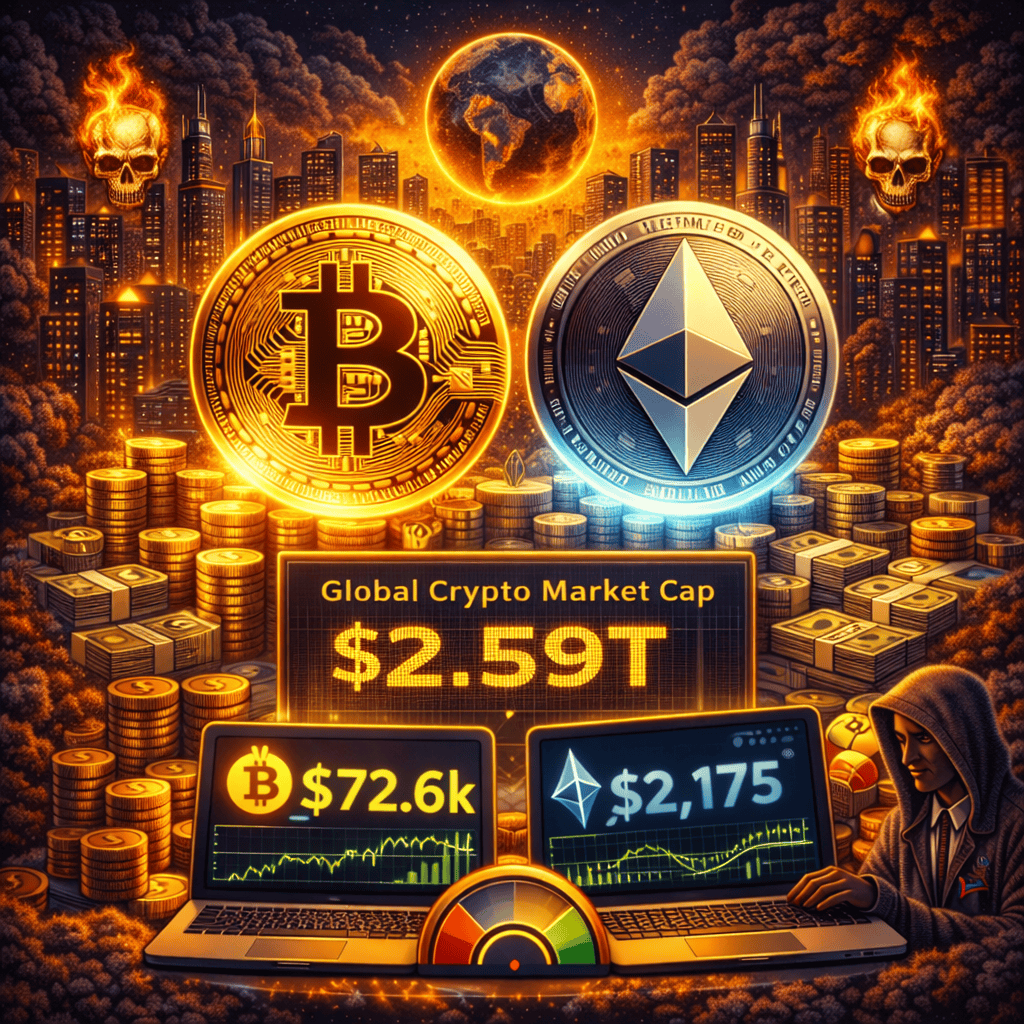 The global crypto market capitalization reached about $2.59 trillion, while Bitcoin traded near $72,600 and Ethereum near $2,175. Despite extreme-fear indicators among traders, prices showed modest gains during the day.