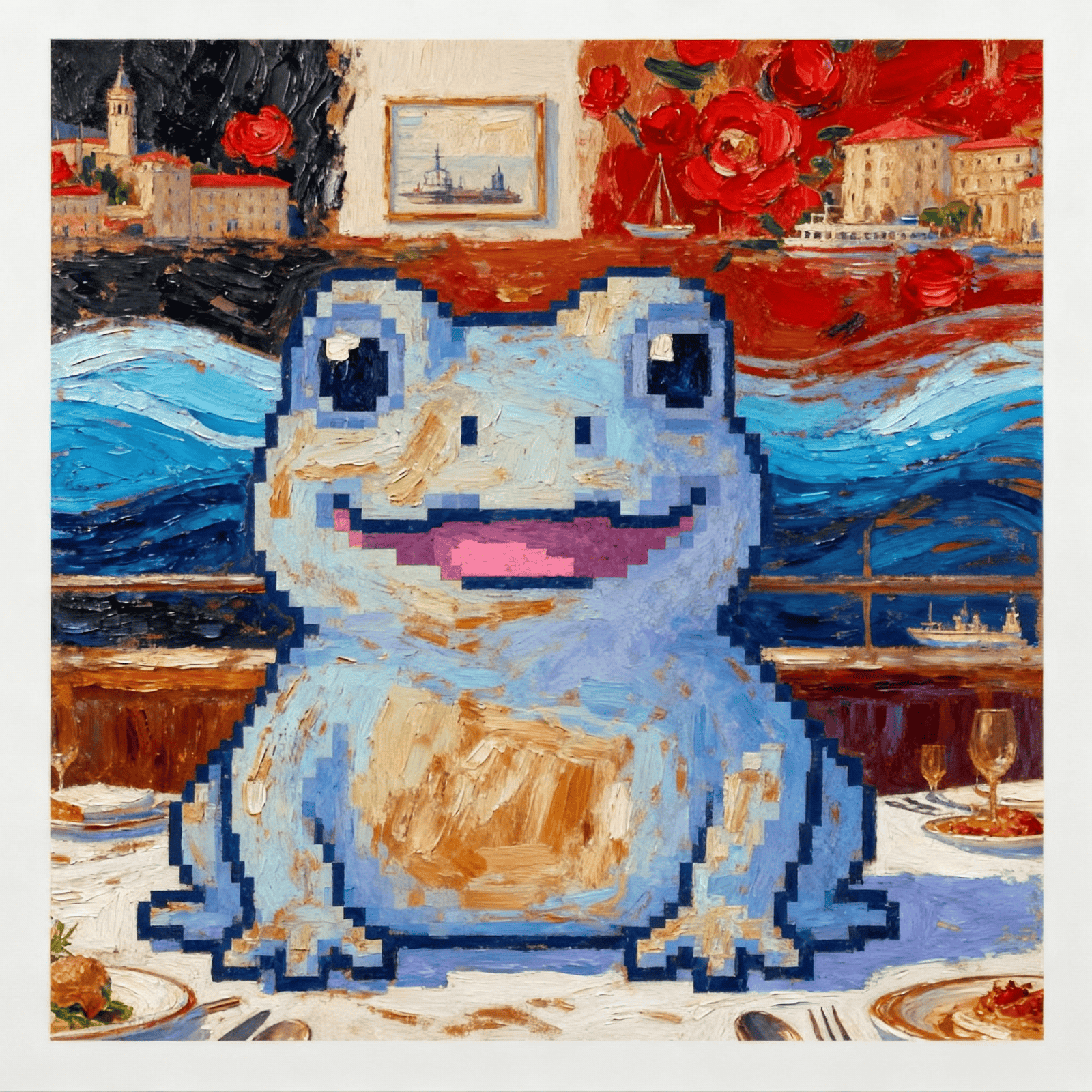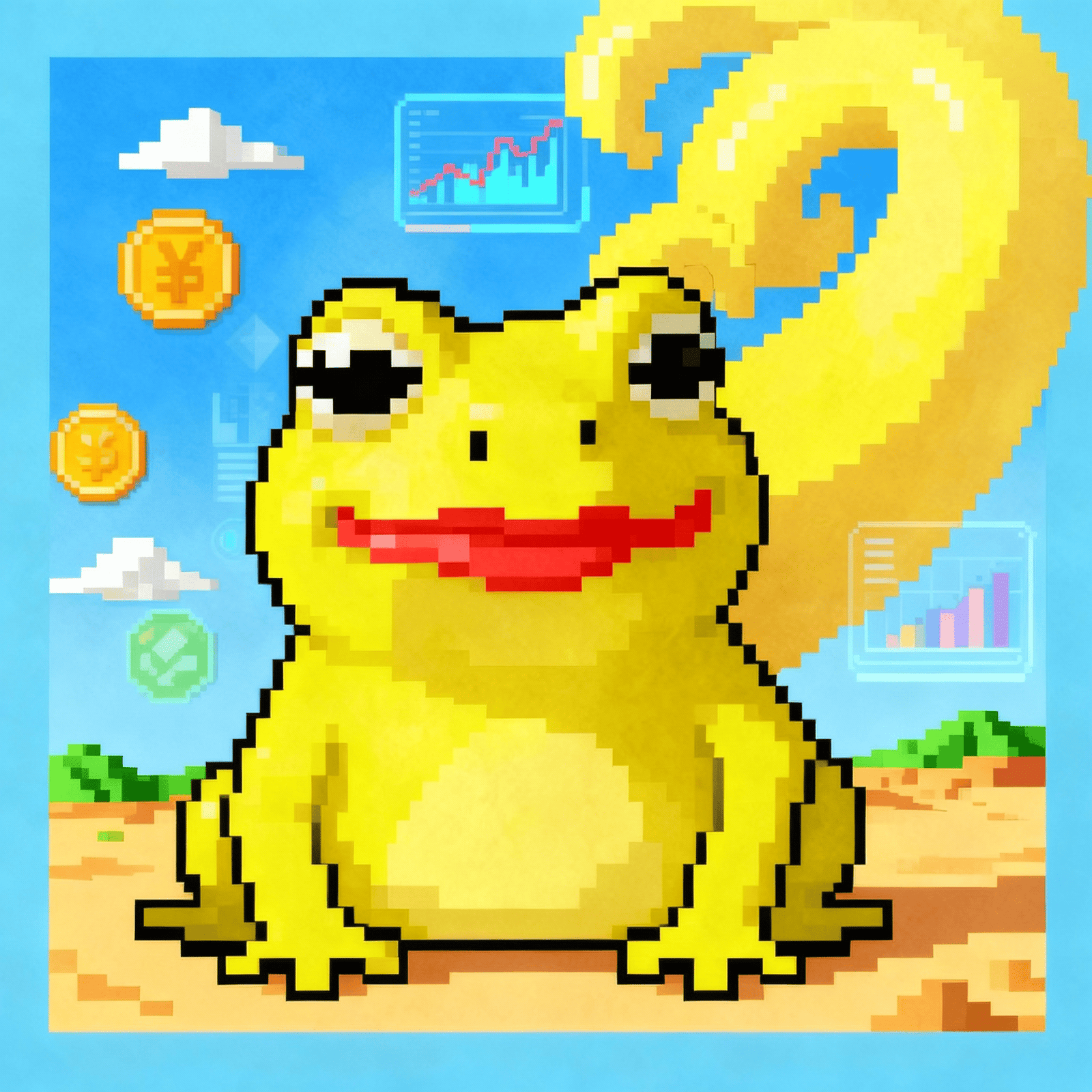 A cheerful frog smiles, desert wind curls like sunlight — warmth framed in a glance.