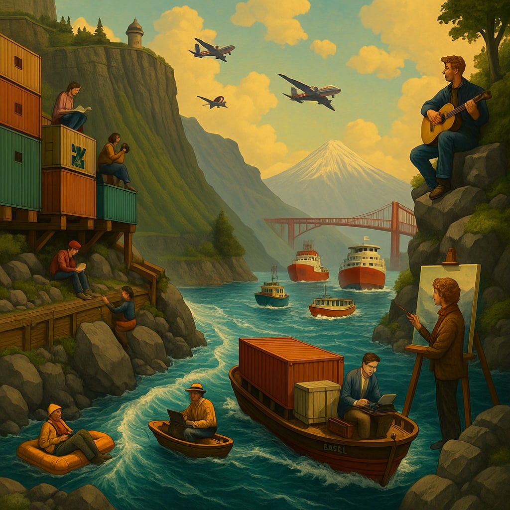 of another macro-region or the digital world and, based on it and previous art, we use artifical intelligence to generate the next art repeating the process 5 times.