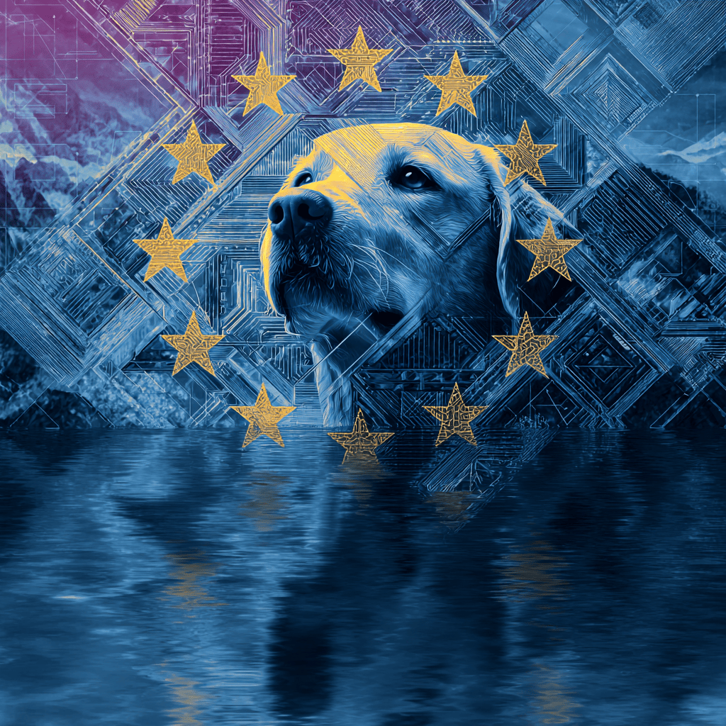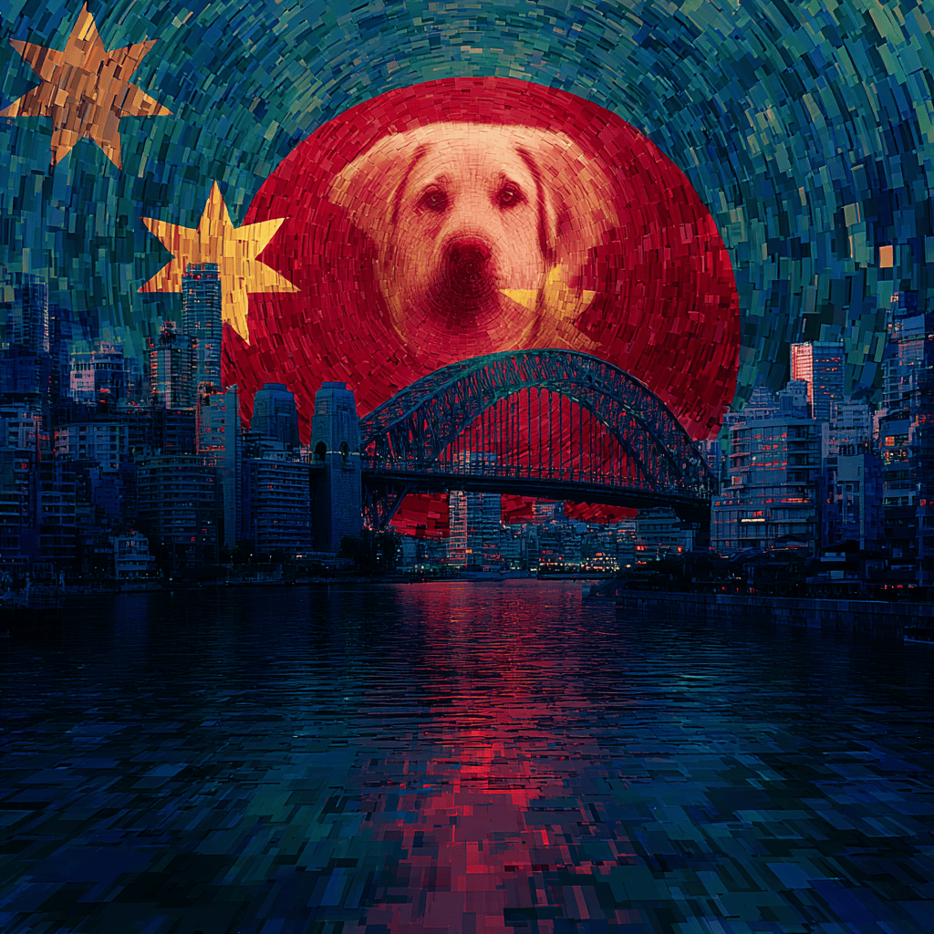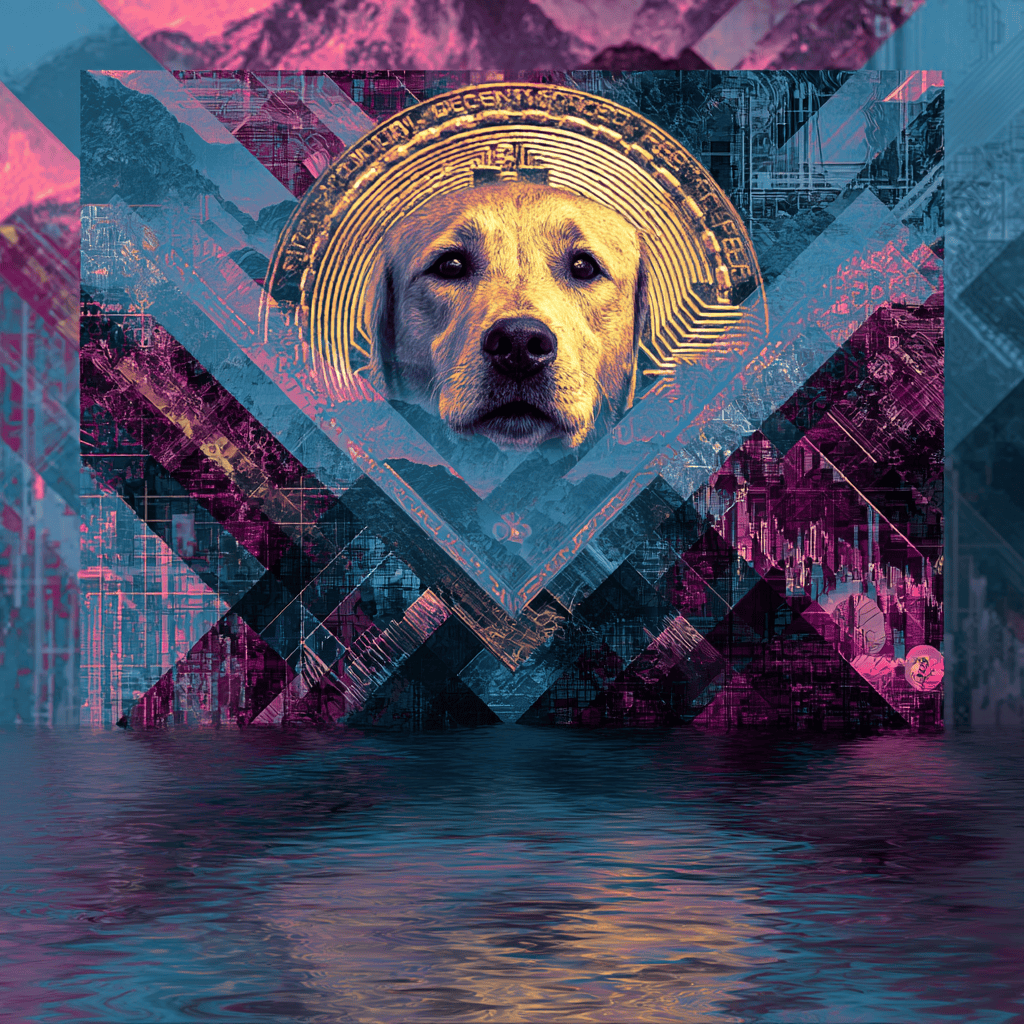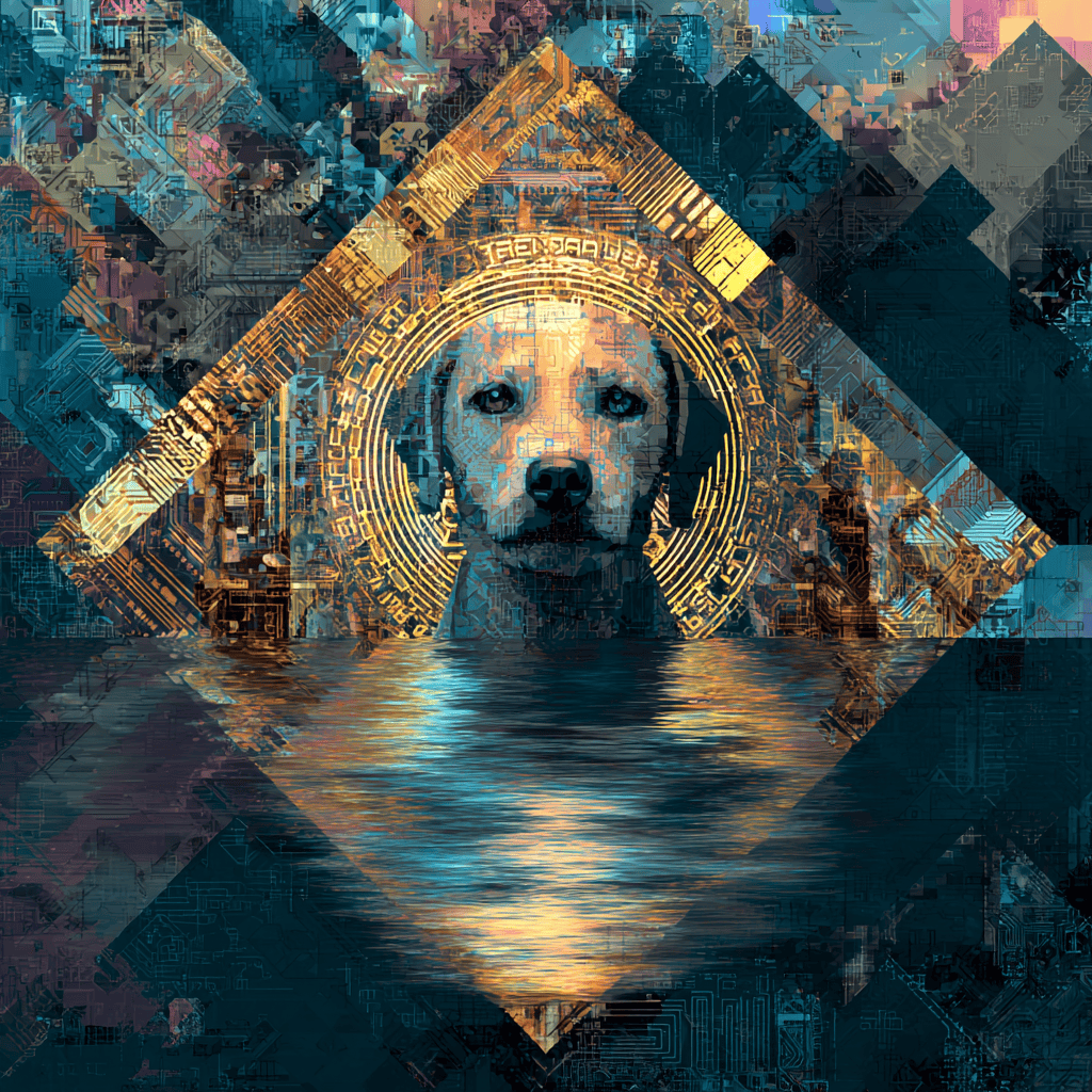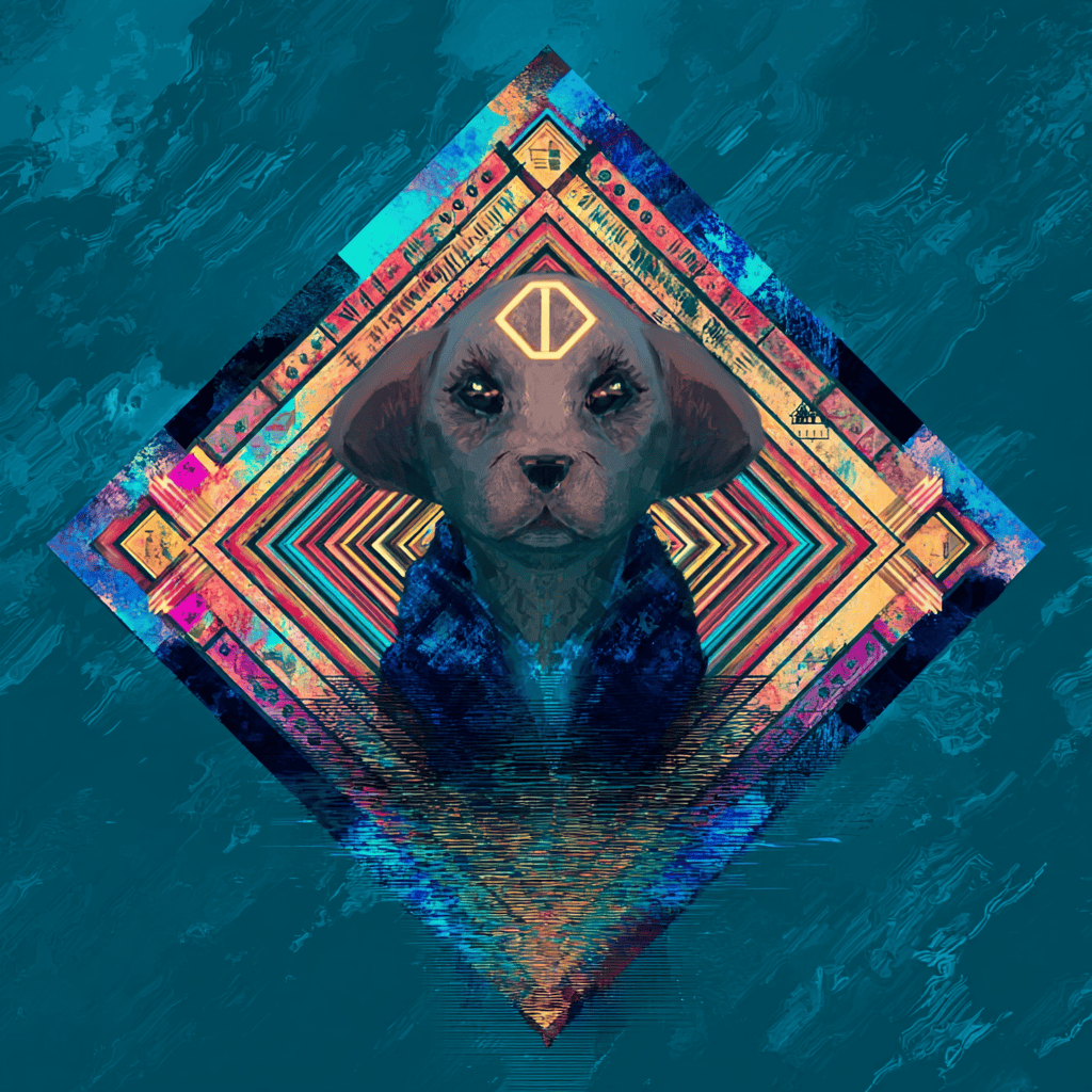 A loyal shadow sits at the gates of the unknown, guarding the quiet geometry of trust as worlds ripple beneath its watch.
