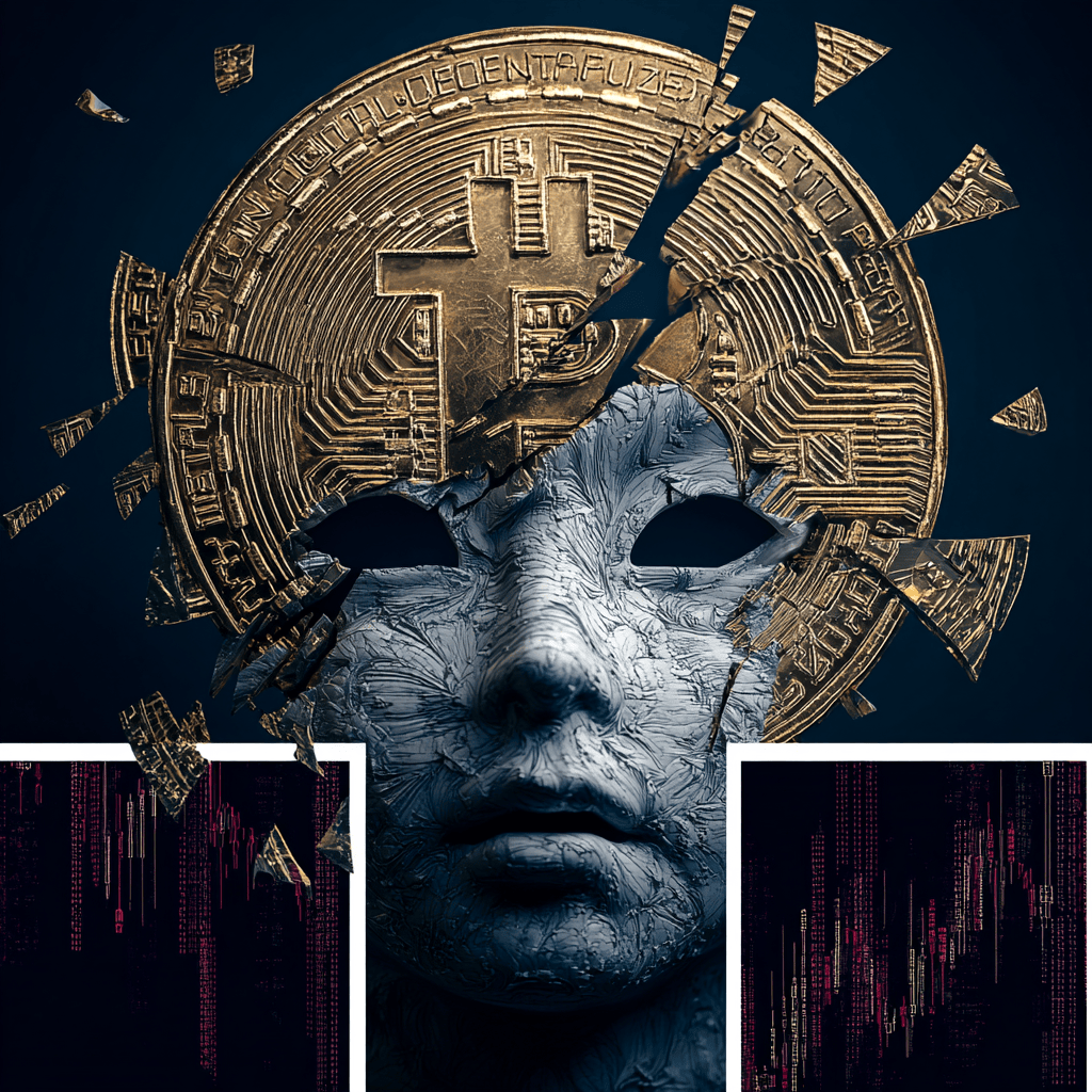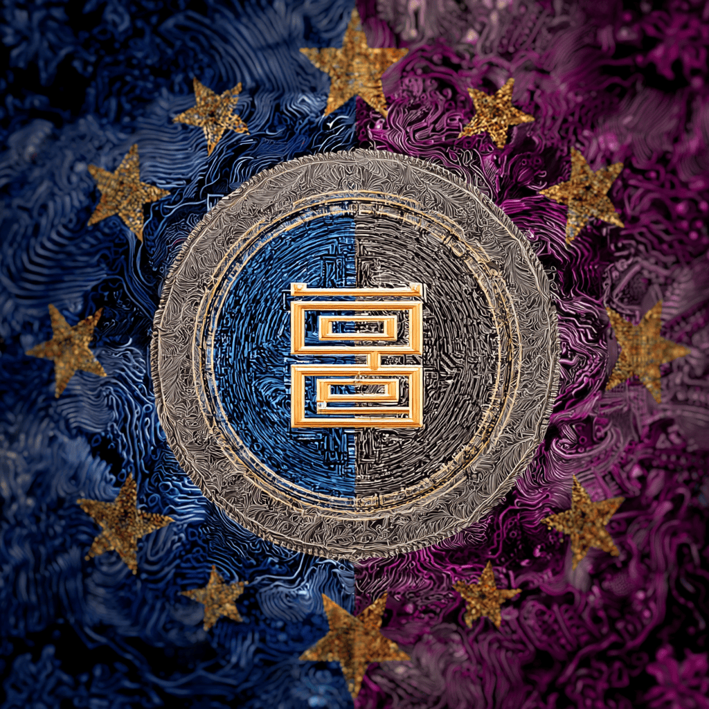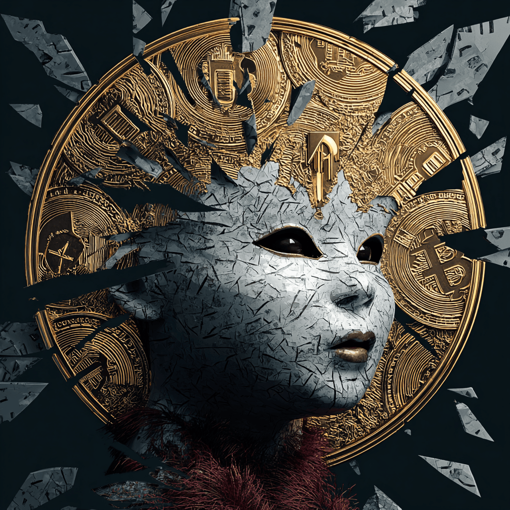 She rises from broken shards of tomorrow, crowned by the circling gold of human belief — proof that even in a world of code and coin, the soul still leans toward the light.