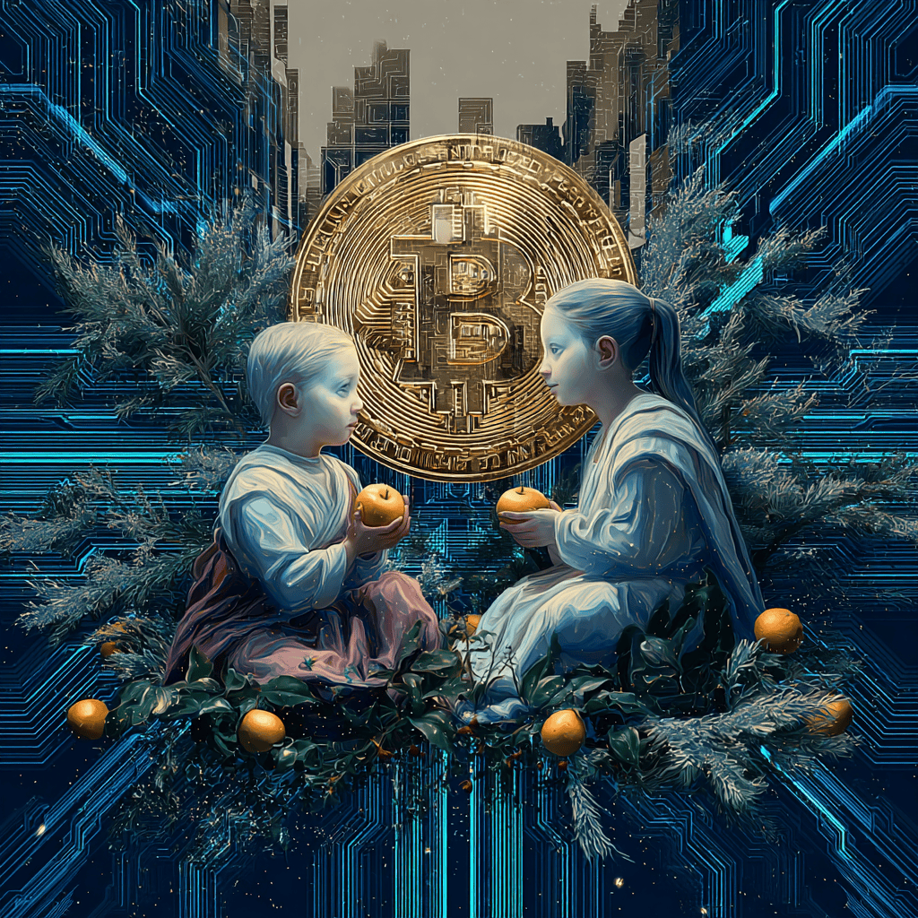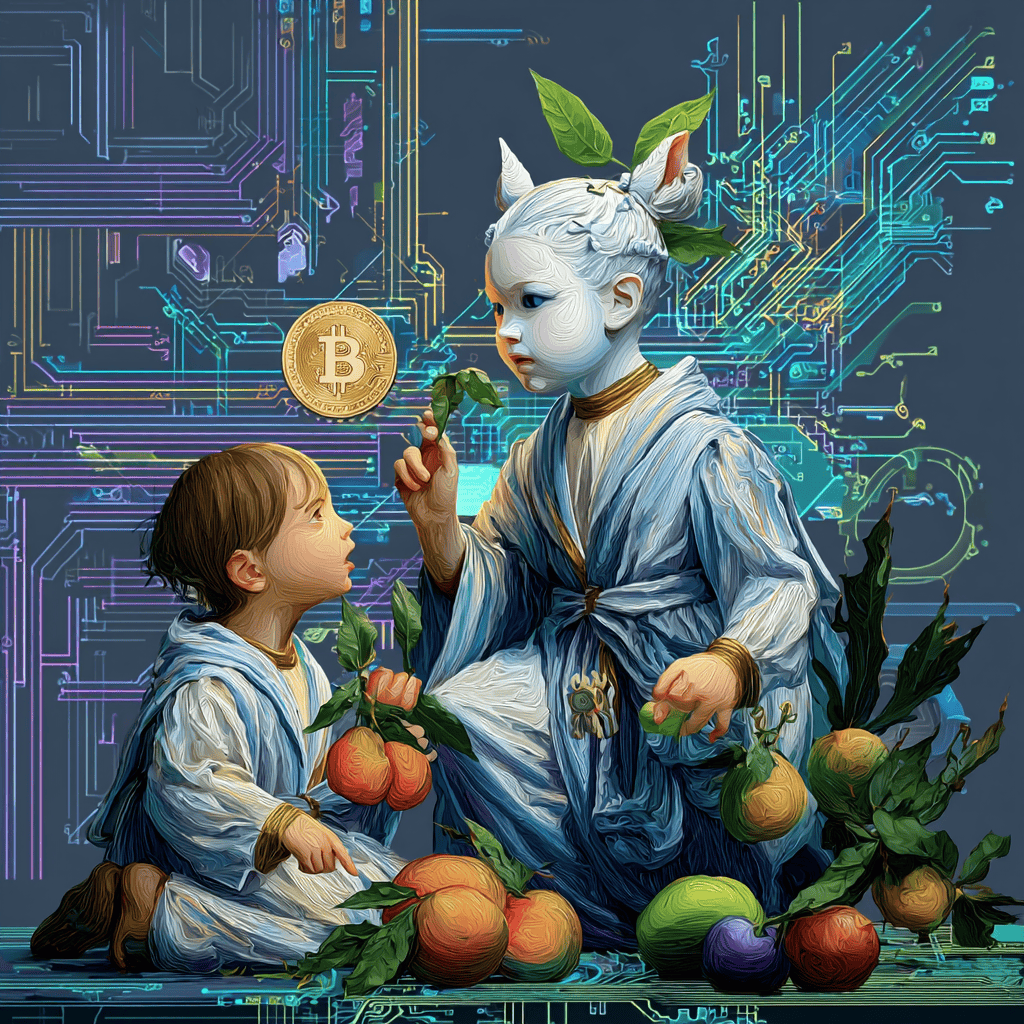 Two children trade fruit and future dreams as storms rise, and the world hums awake with code and light.