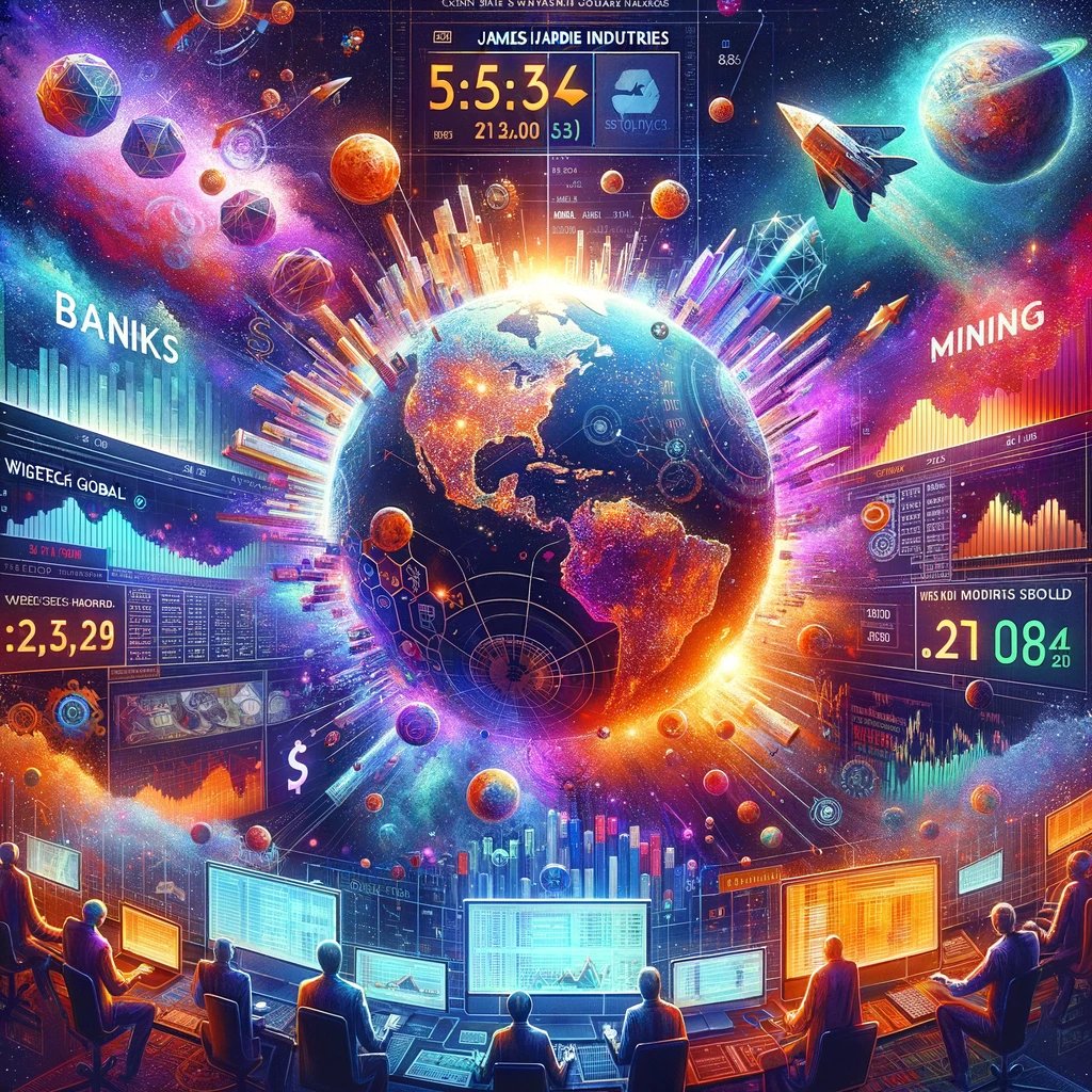 Australian stocks decline, with James Hardie Industries hitting a 5-month low. Banks stumble, contributing to the overall decline in the market. Mining sector sees modest gains, driven by a surge in iron ore prices. Tech sector outperforms, with stocks like Xero and WiseTech Global showing notable gains.