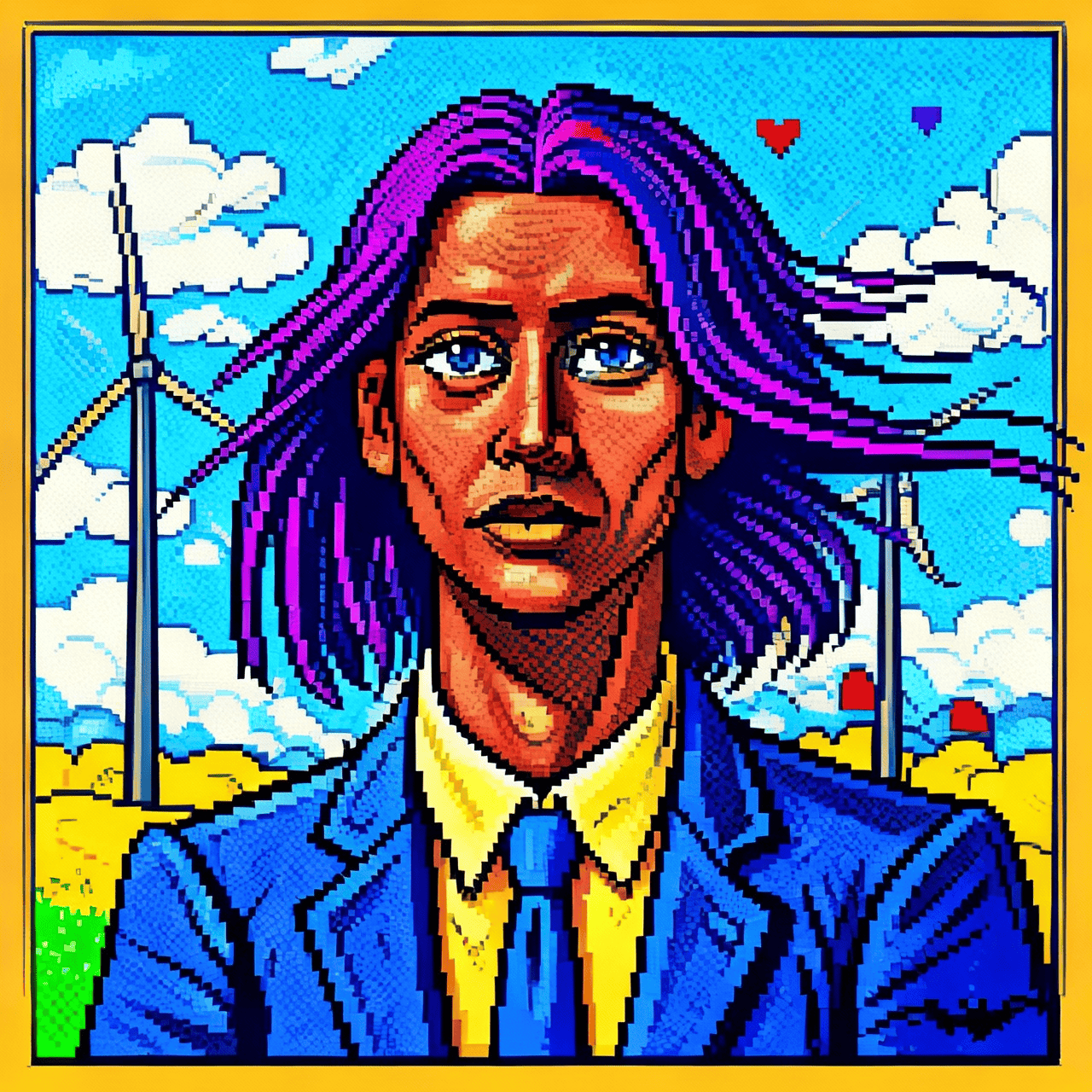 Purple hair in wind, suits and turbines share the sky — progress painted bold.
