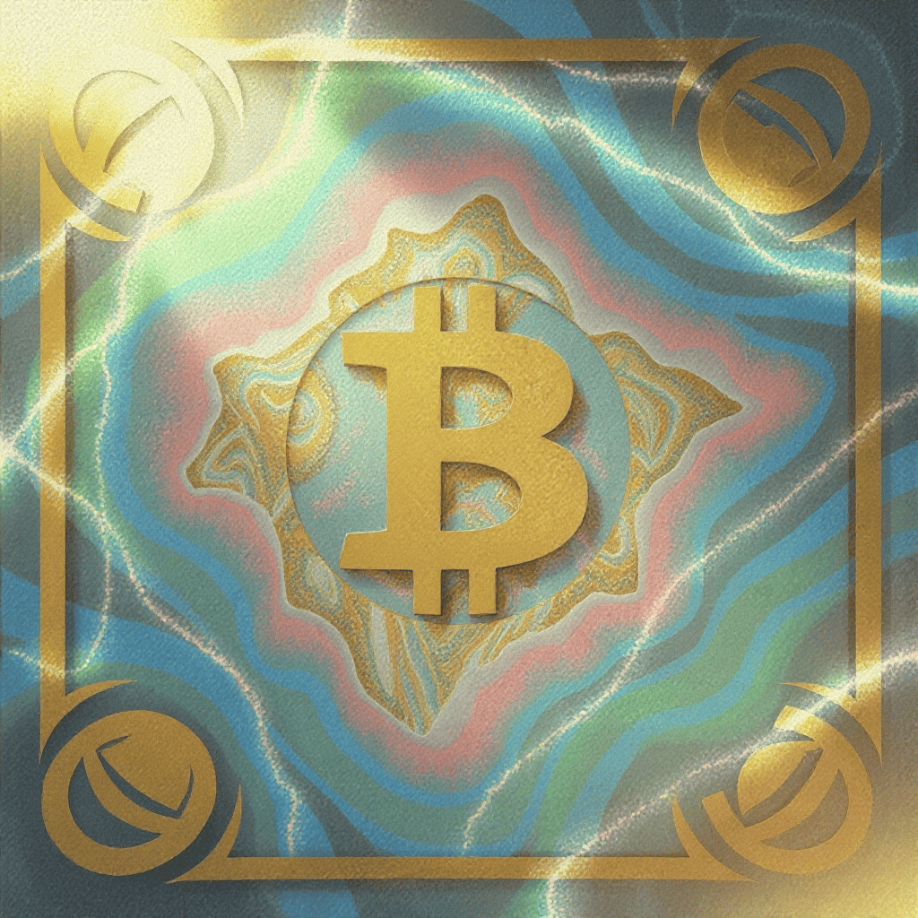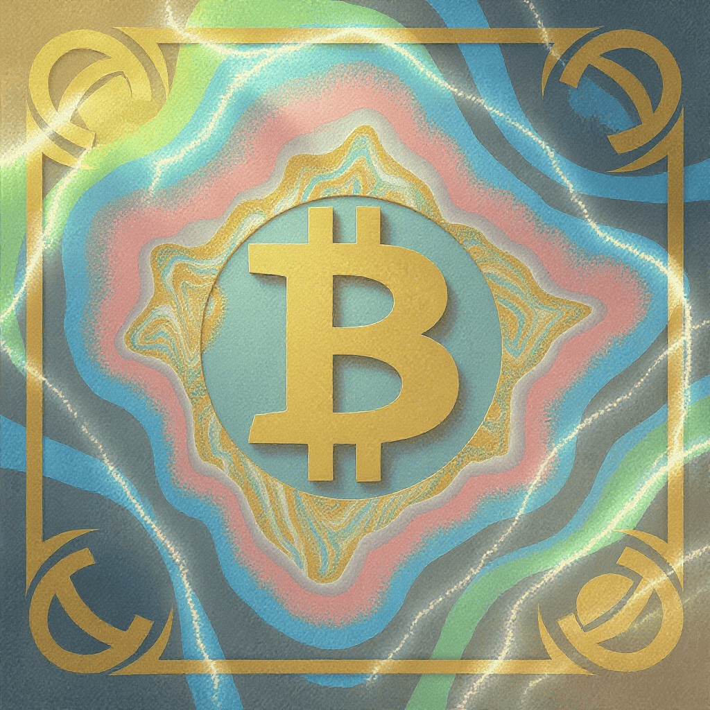 Golden Bitcoin shines, framed by swirling waves of light — value flows like streams.