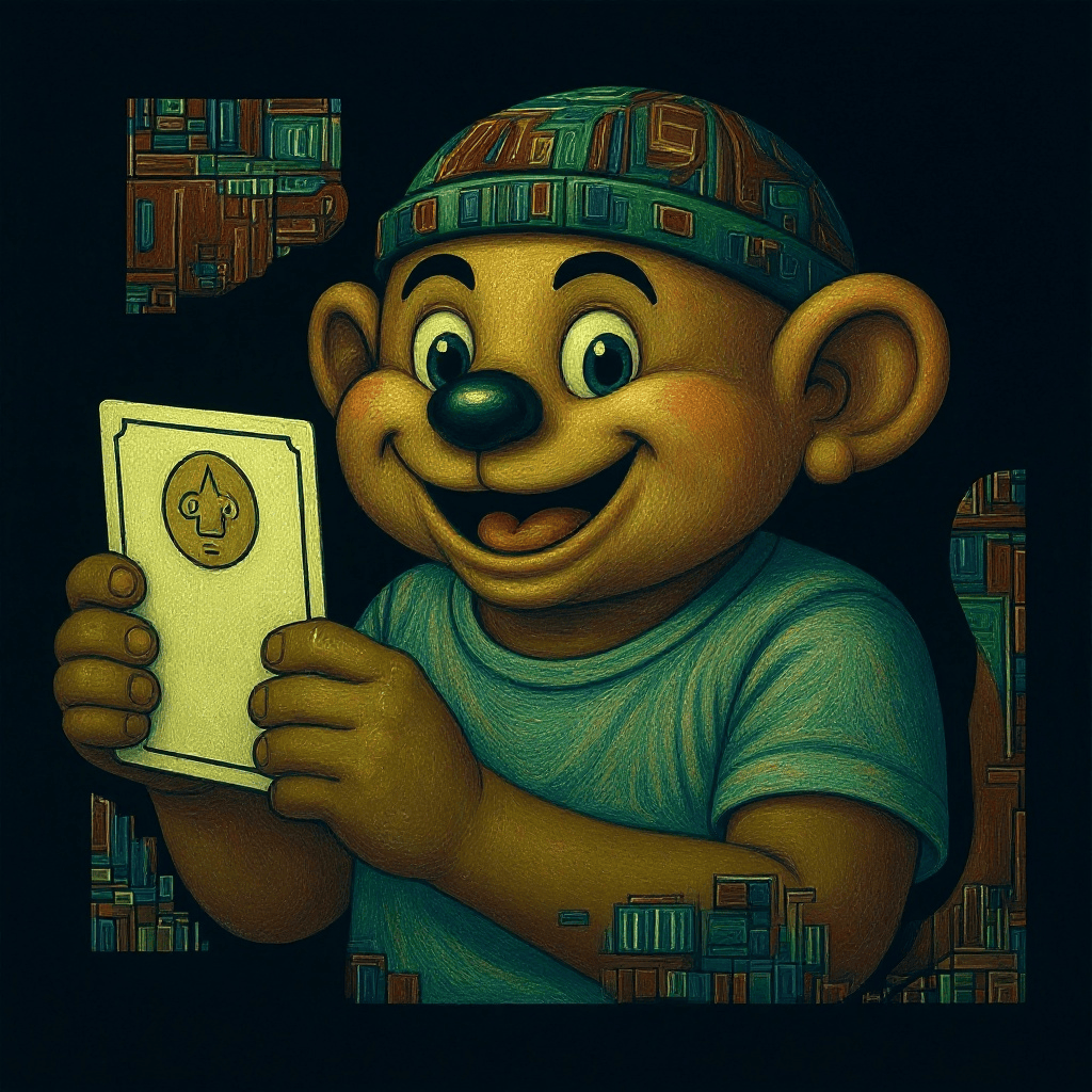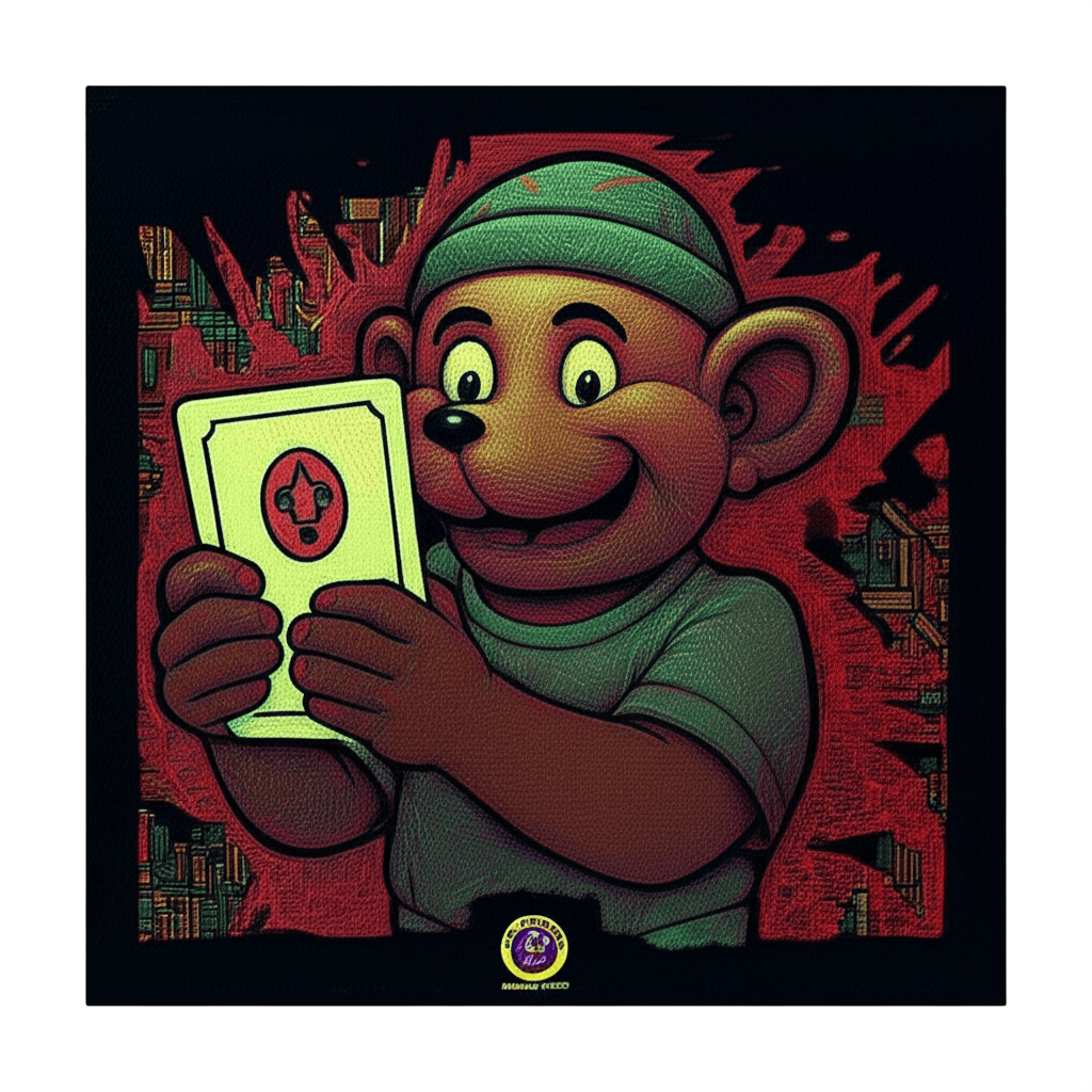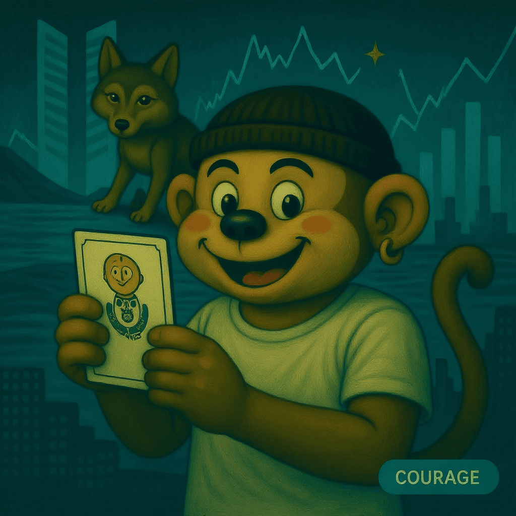 A spiral above, monkey grins with card in hand — wolf shadows the trade.