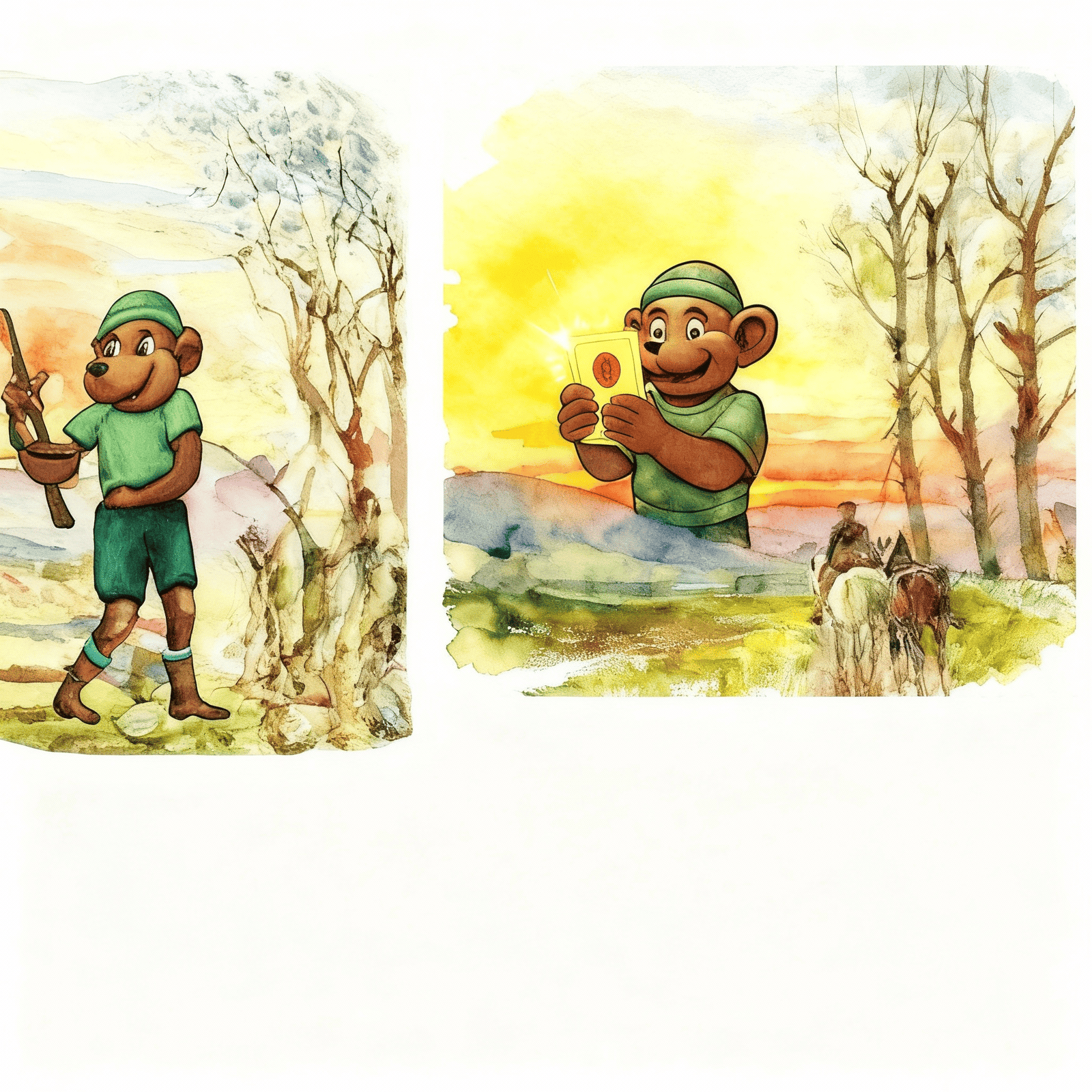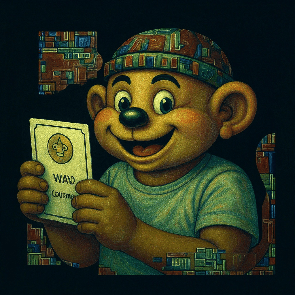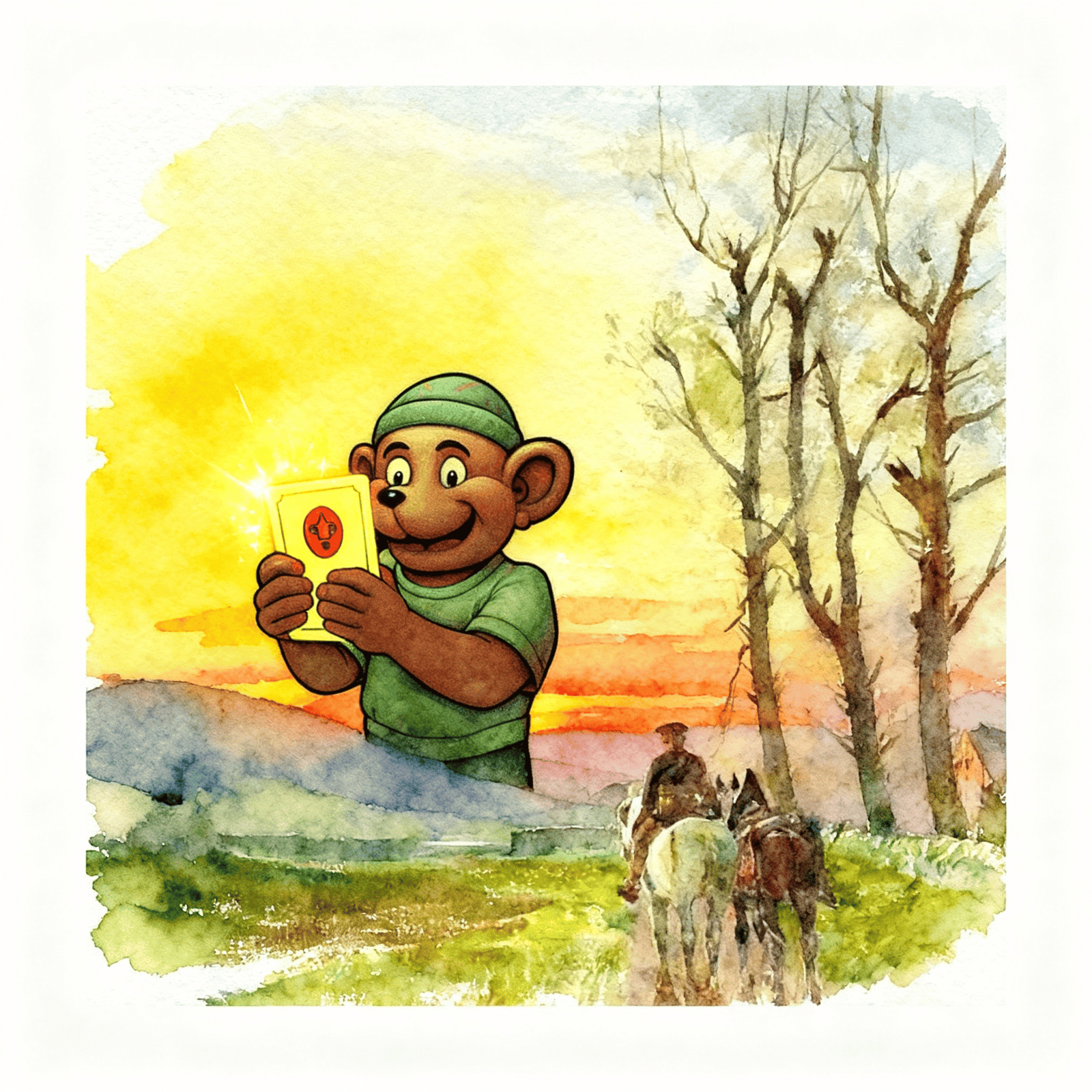 A spiral above, monkey grins with card in hand — wolf shadows the trade.