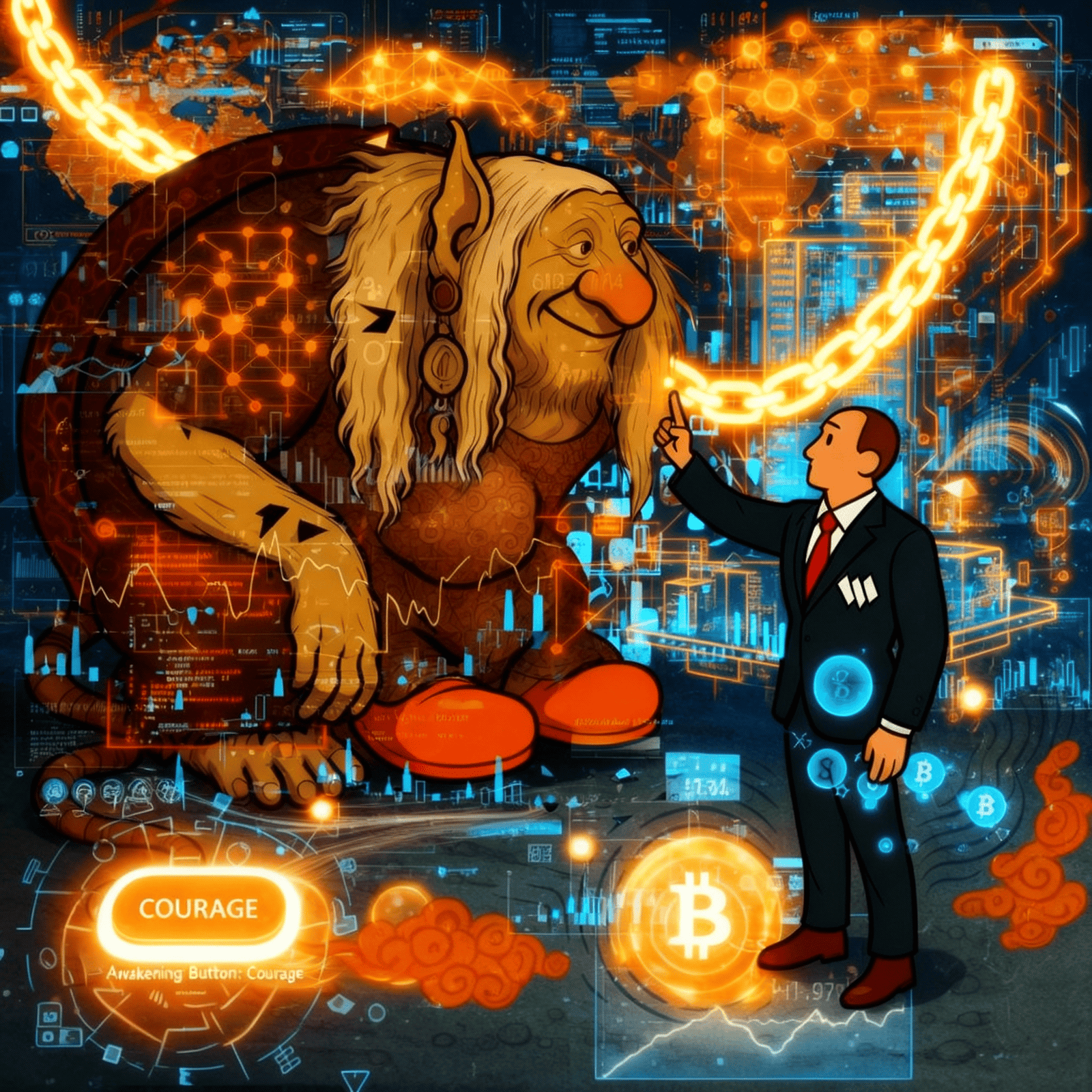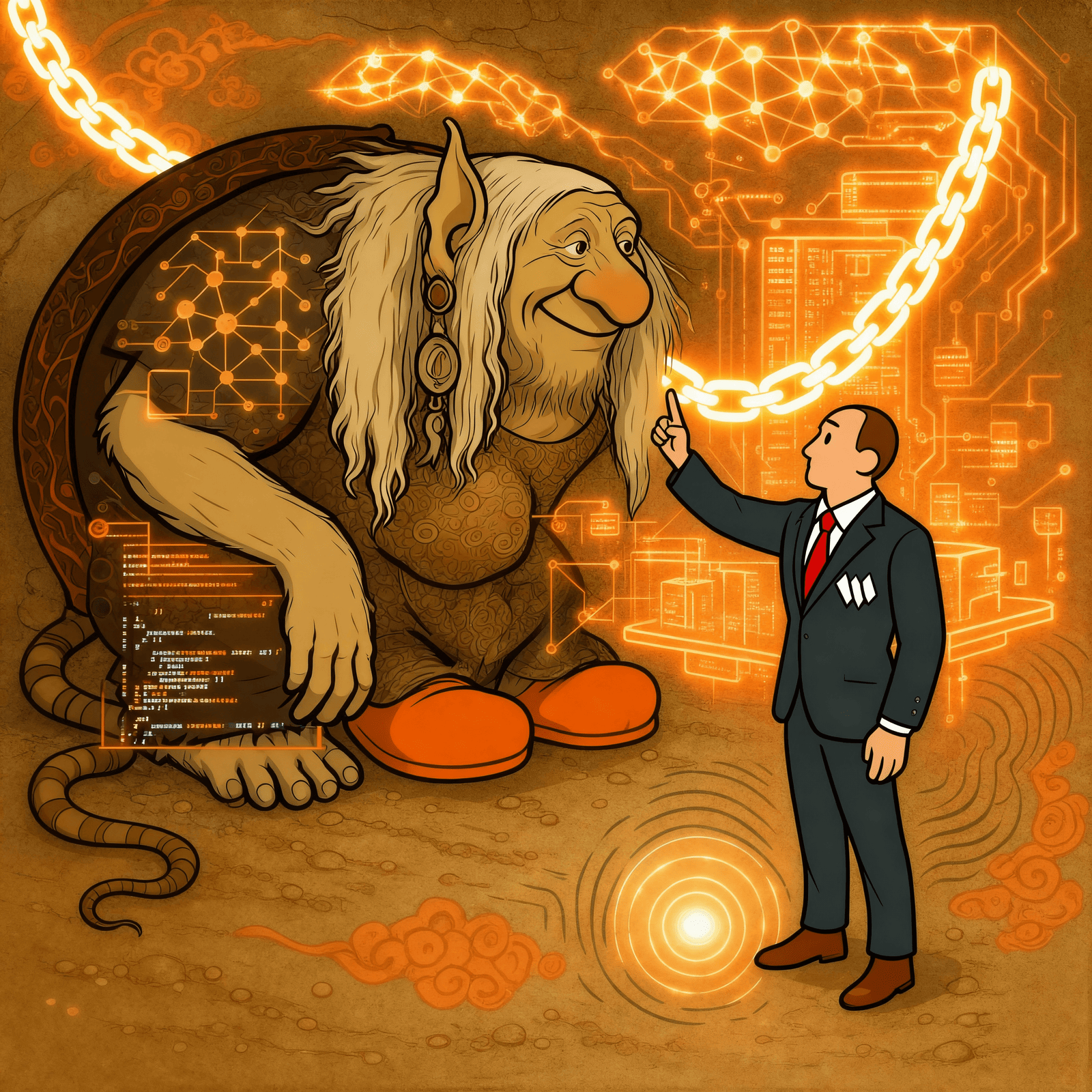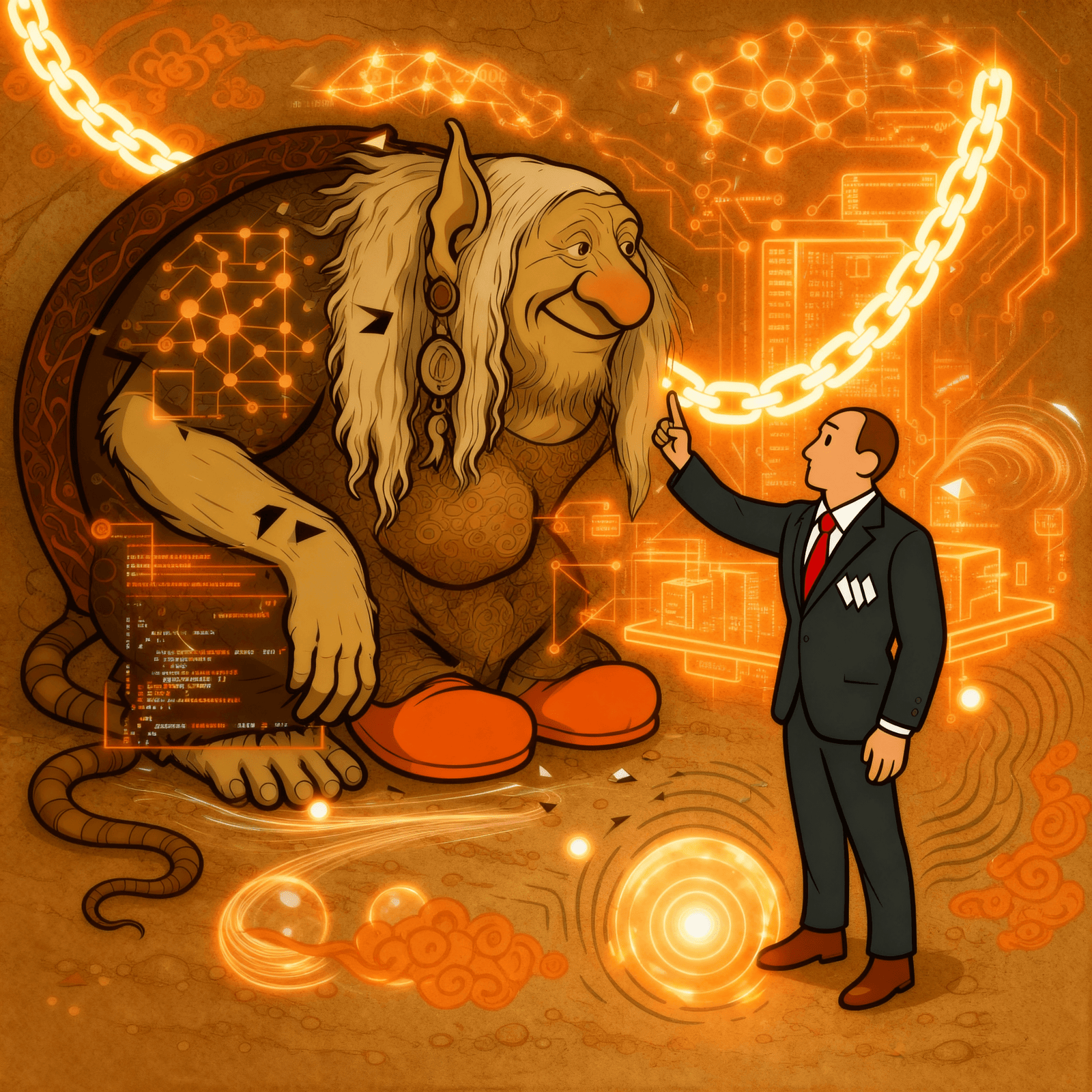 A troll listens close, suits draw maps of glowing chains — wisdom trades in code.