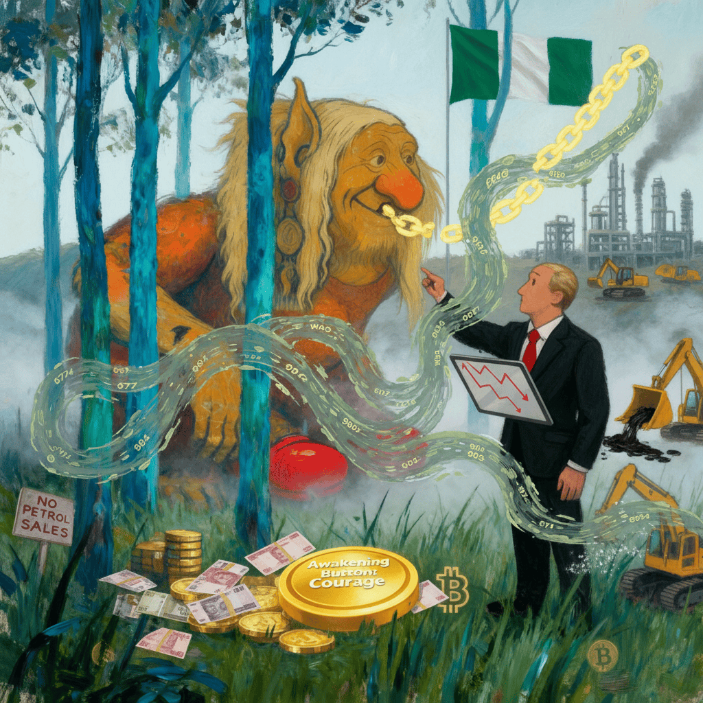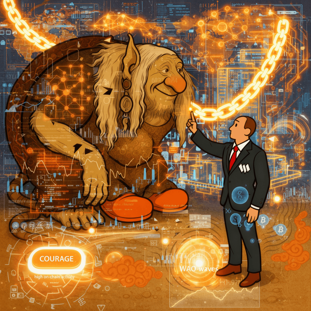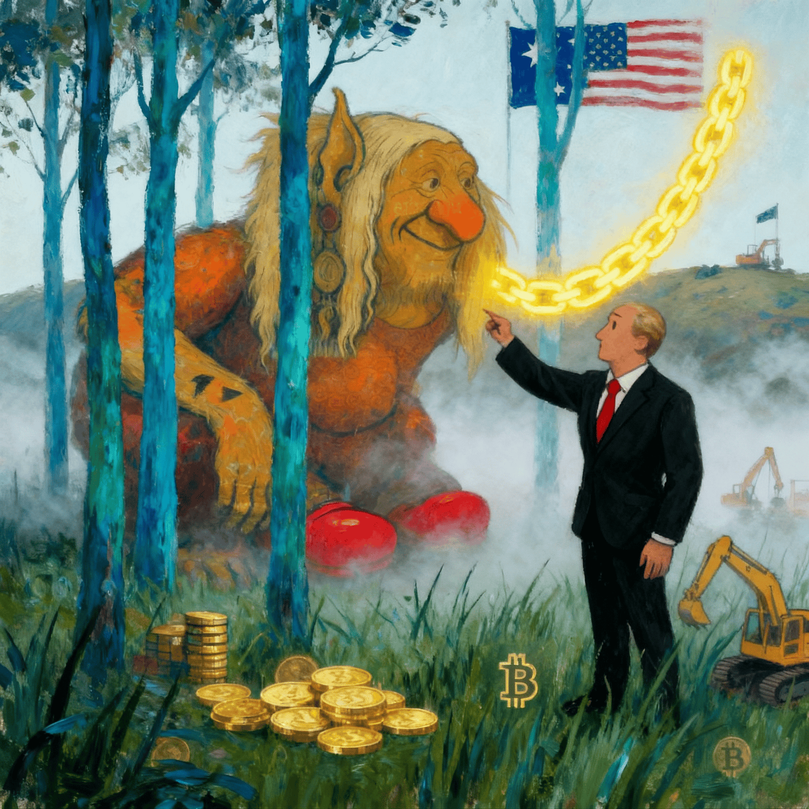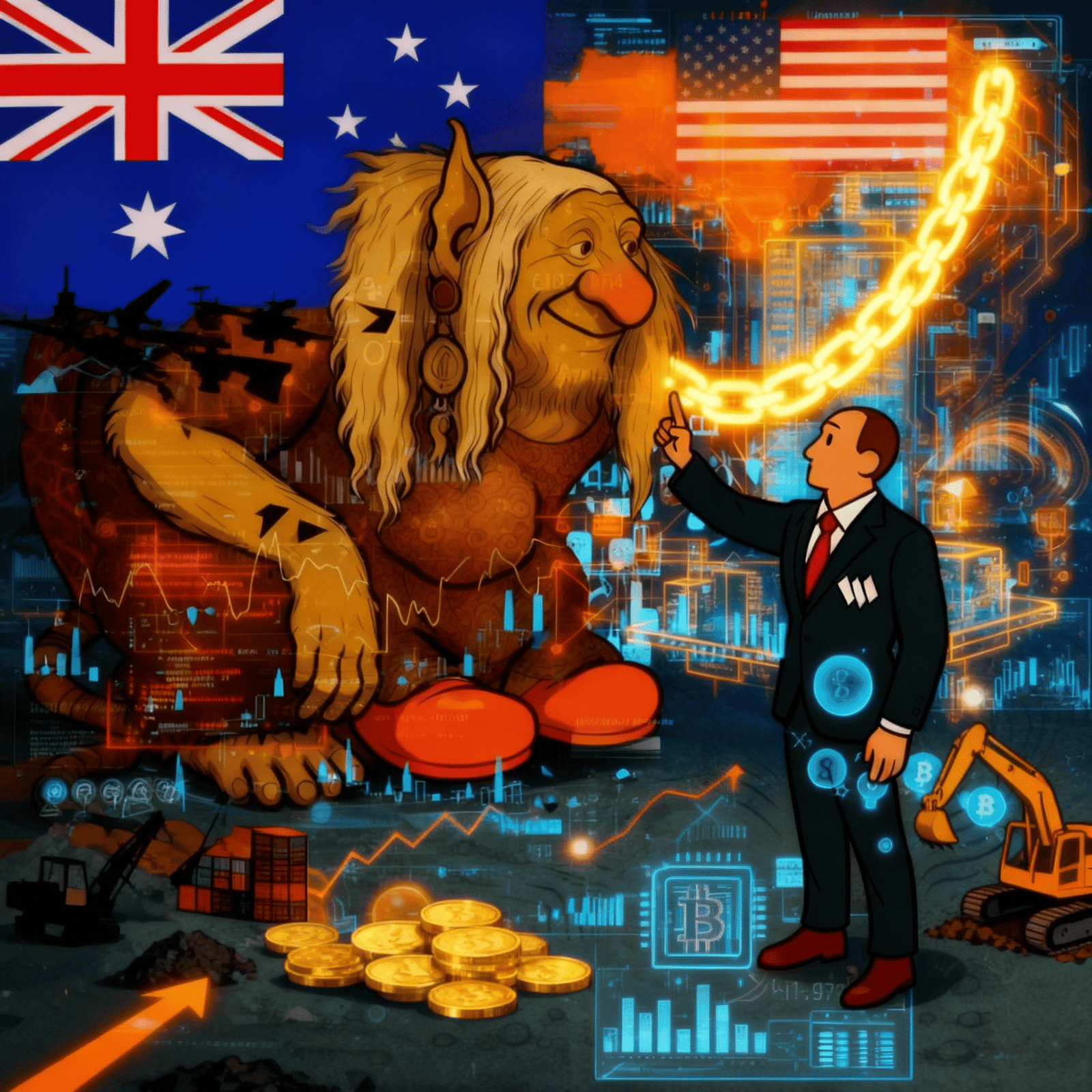 A troll listens close, suits draw maps of glowing chains — wisdom trades in code.