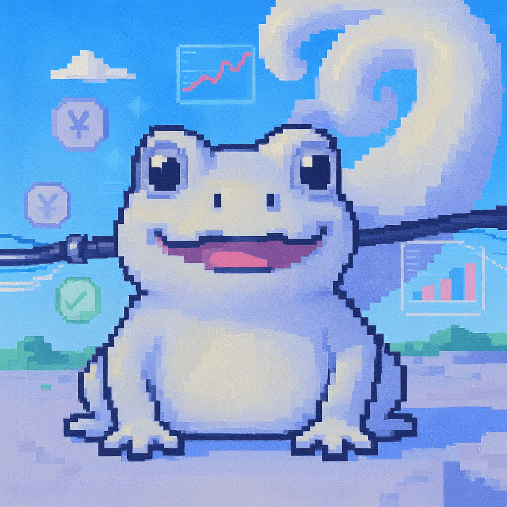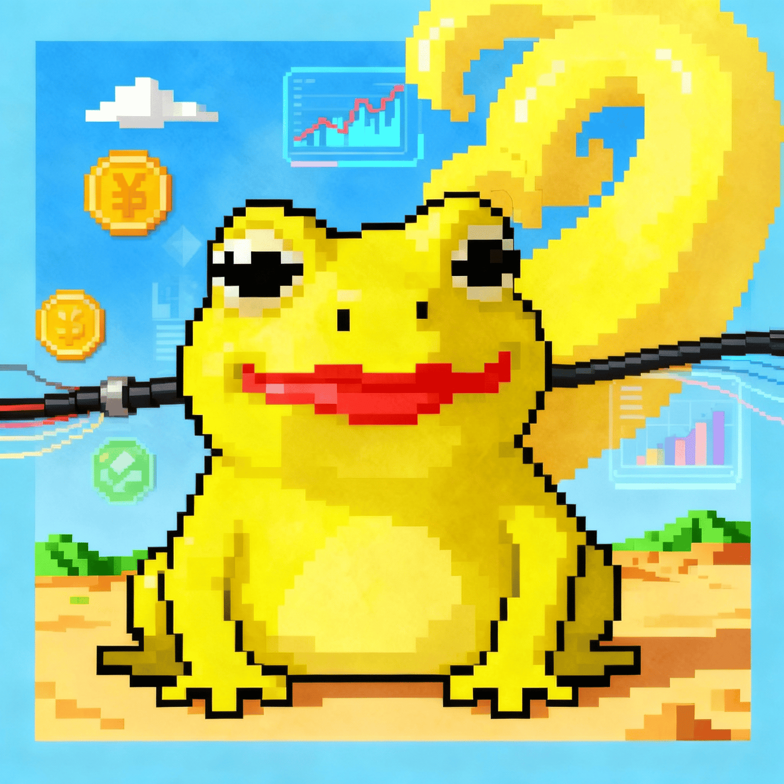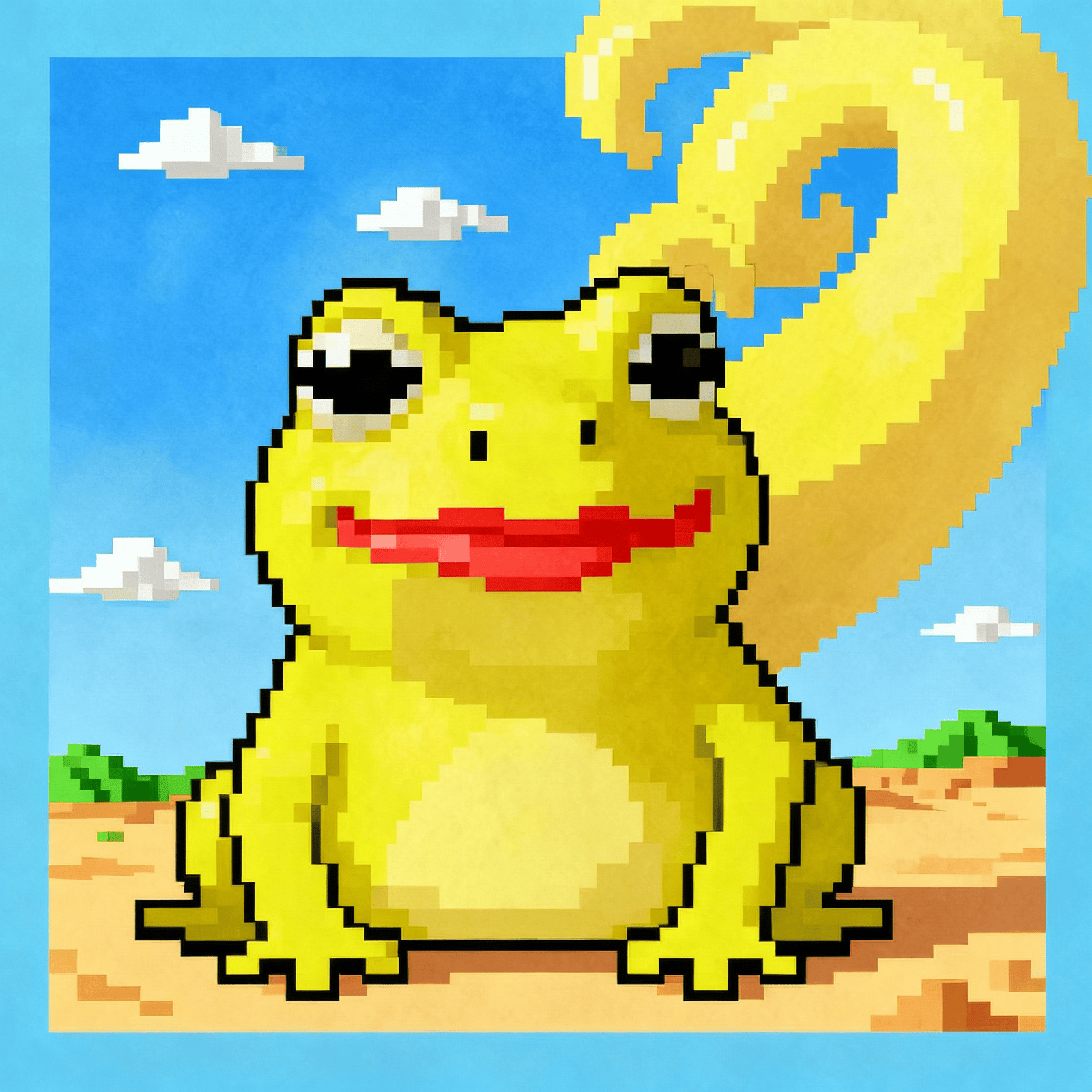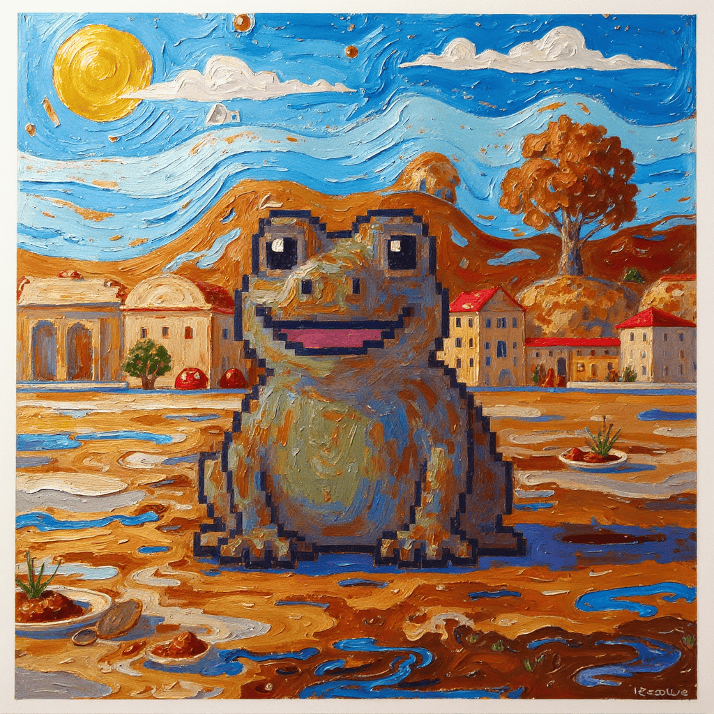 A cheerful frog smiles, desert wind curls like sunlight — warmth framed in a glance.