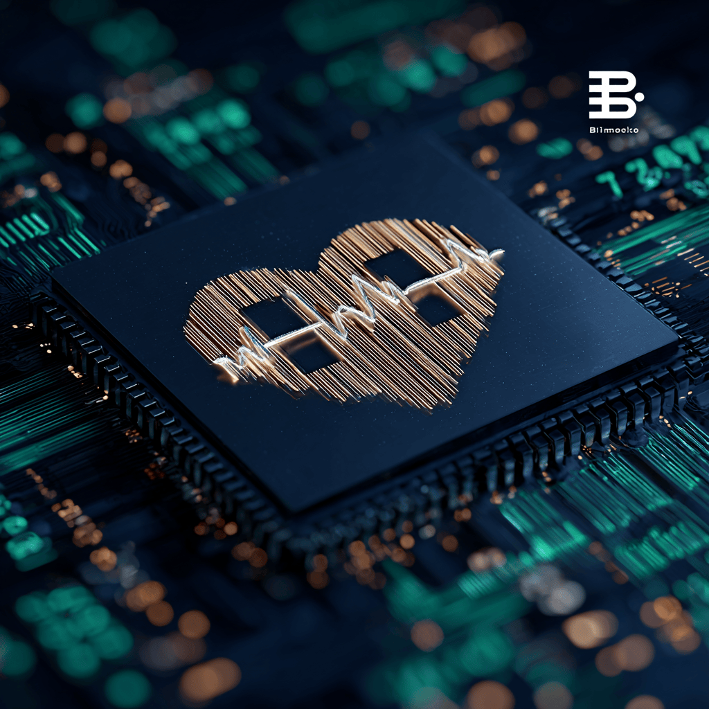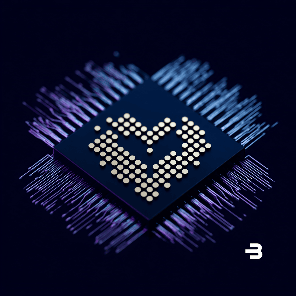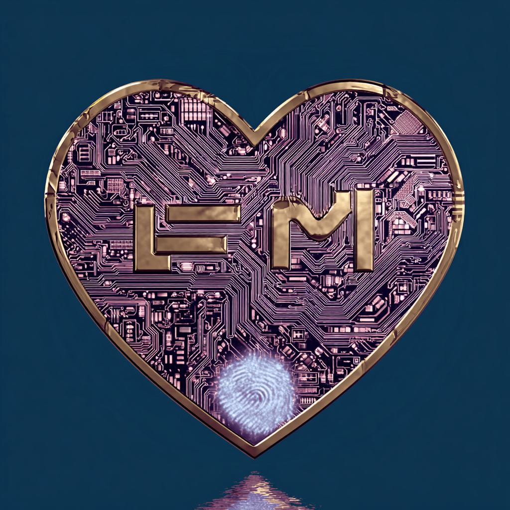 Digital heart pulse, fingerprints etched in circuits — identity hums.