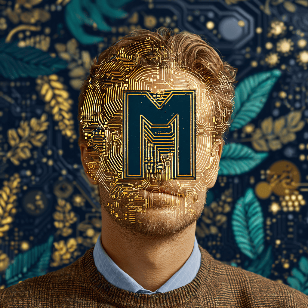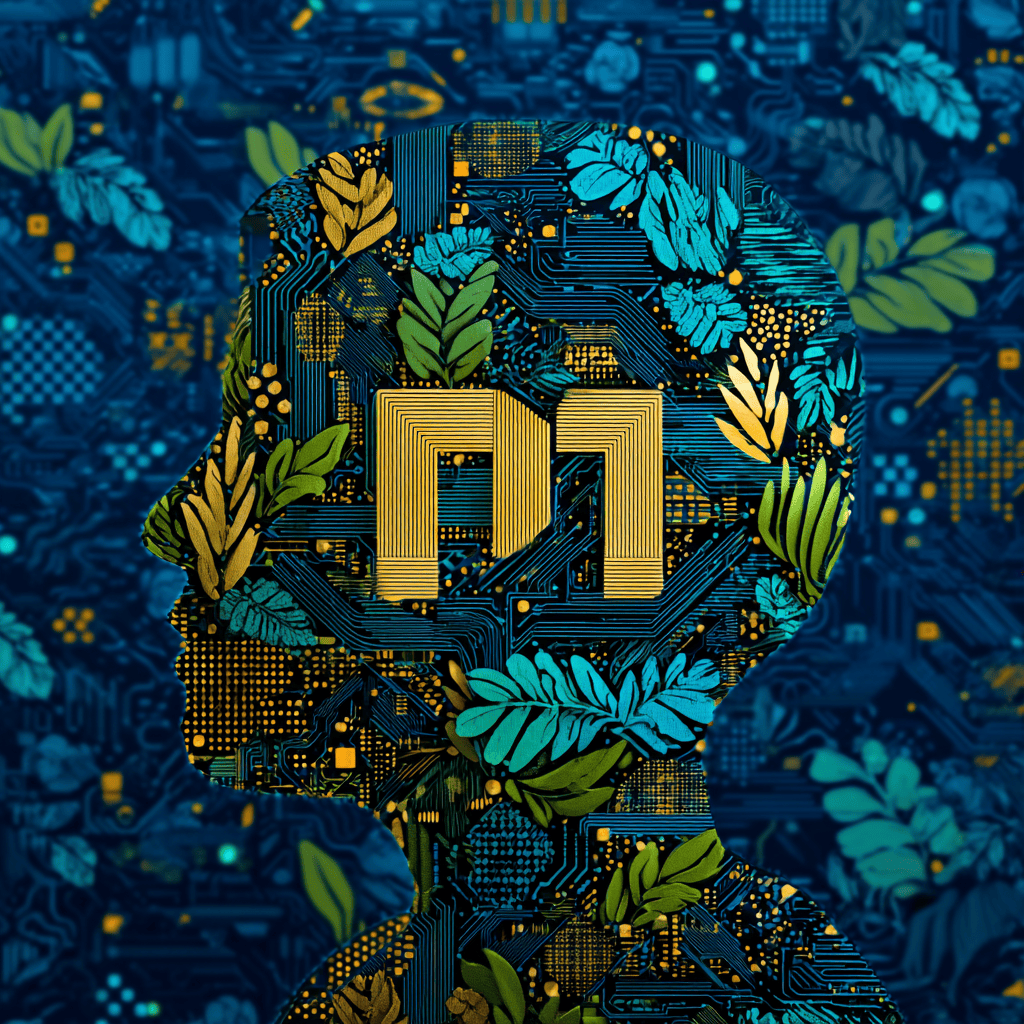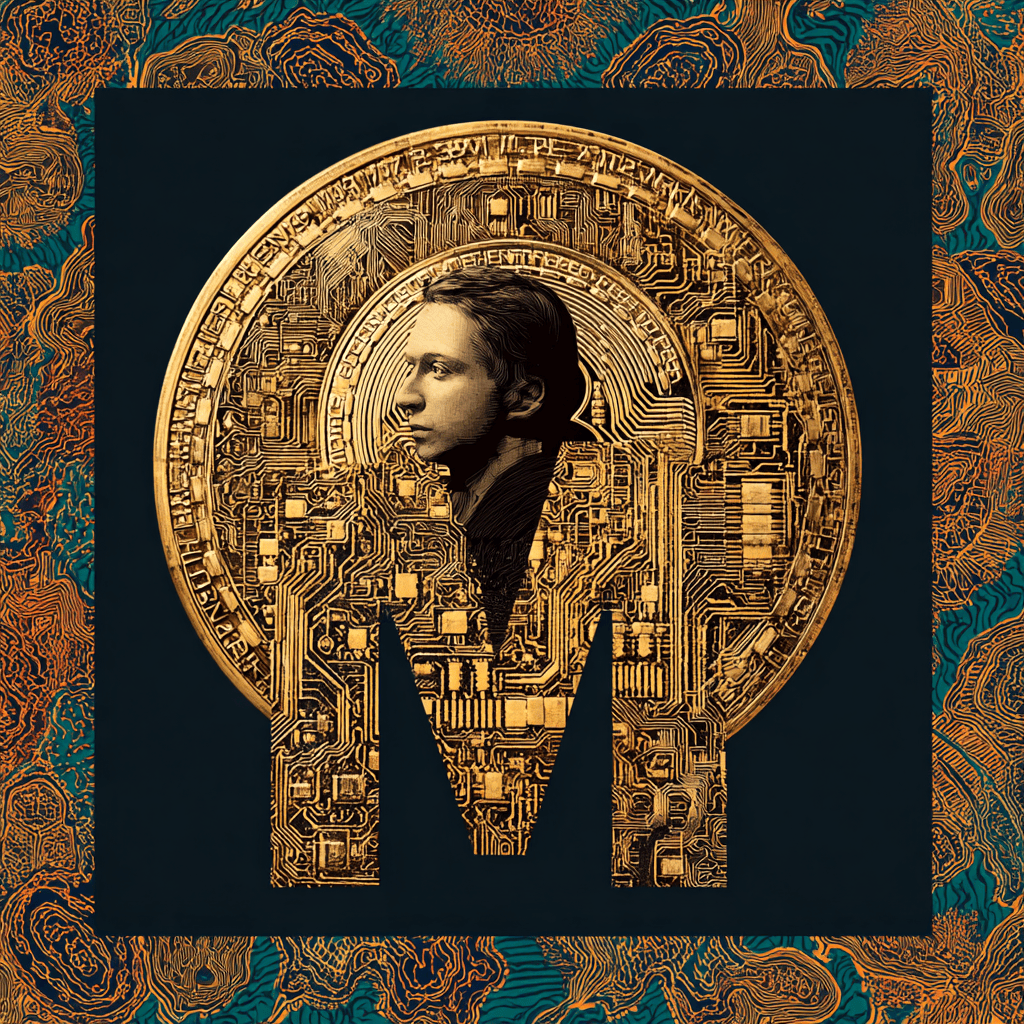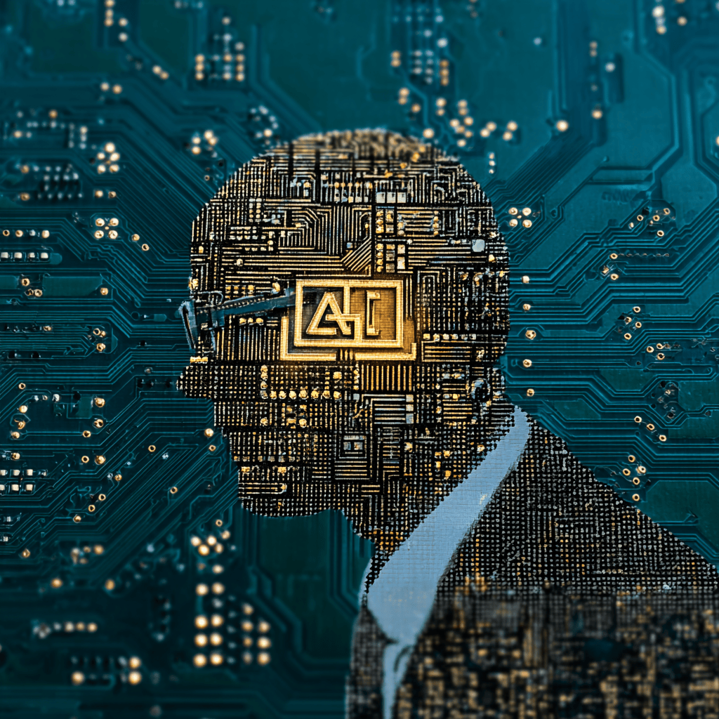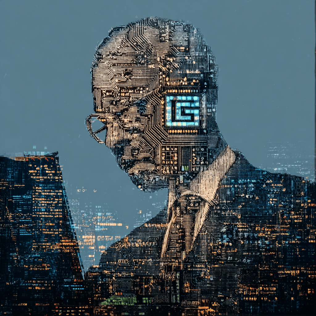 City lights converge, a thinker framed in circuits — code becomes skyline.